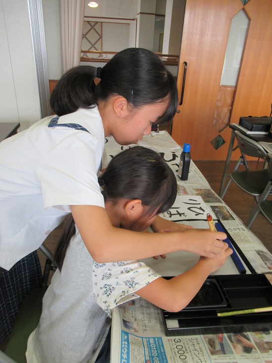 書道部の生徒4名は、小学2年生から6年生までの8名の習字の宿題のお手伝いをさせていただきました。  はじめて習字に挑戦する児童に筆の持ち方から教えたり、お手本を書き、それを見ながら練習する児童を励ましたり・・・と、一人ひとりに児童の要望に応えながら、習字を書くお手伝いをさせていただきました。