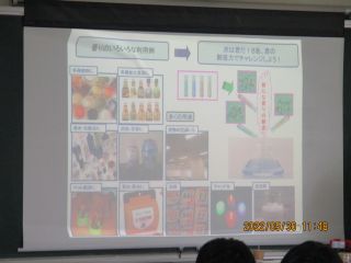 美味しさと香り。 香りの不思議な世界と題して東京農業大学食香粧化学科佐藤広顕先生の特別授業です。令和4年5月30日(月)3限目農業科2年生が教室で受けました。 投稿公開日:2022 年 7 月 14 日 投稿カテゴリー:トピック 味と香りについて説明をしてくださいました。 今日は農業科2年生全員がHRで、特別授業を受けました。 食品の色に関するイメージについて、好きな色に手を上げました。 これから3種類の香りの液をそれぞれの紙に含ませてみんなで匂うことにします。 この試験紙はパイナップルの香りです。 水を入れた容器に試験紙を浸すと、全体がその香りになりました。 香りのいろいろな利用例について説明され、香りが様々な食材に使われていることを最後に学びました。とても興味と関心を持って講演を受けることができました。講演をしていただきありがとうございました。