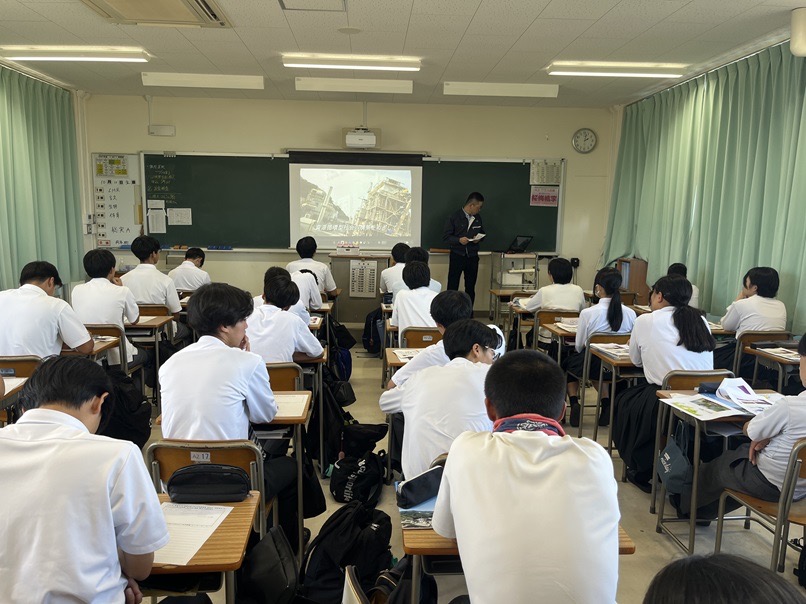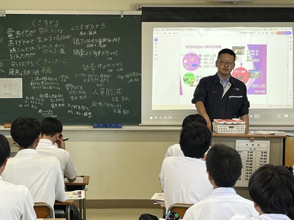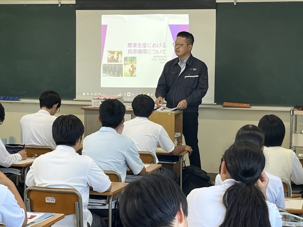 農業科2年生×南国興産(株) ~農業生産における資源循環について学ぶ~ 投稿公開日:2025 年 10 月 15 日 投稿カテゴリー:トピック / 農業科 / 授業・実習風景 農業科2年生では、スマート農業という授業で南国興産株式会社 営業部 肥料営業課 森重歩己氏から、農業生産における資源循環及び畜産副産物の飼料・肥料化等について学びました。また、自分たちが行う課題研究での肥料設計について活発な質疑応答を行いました。