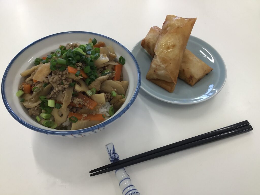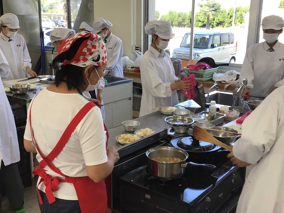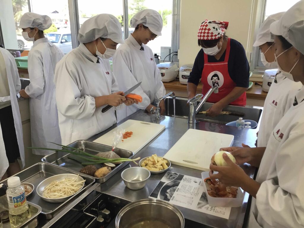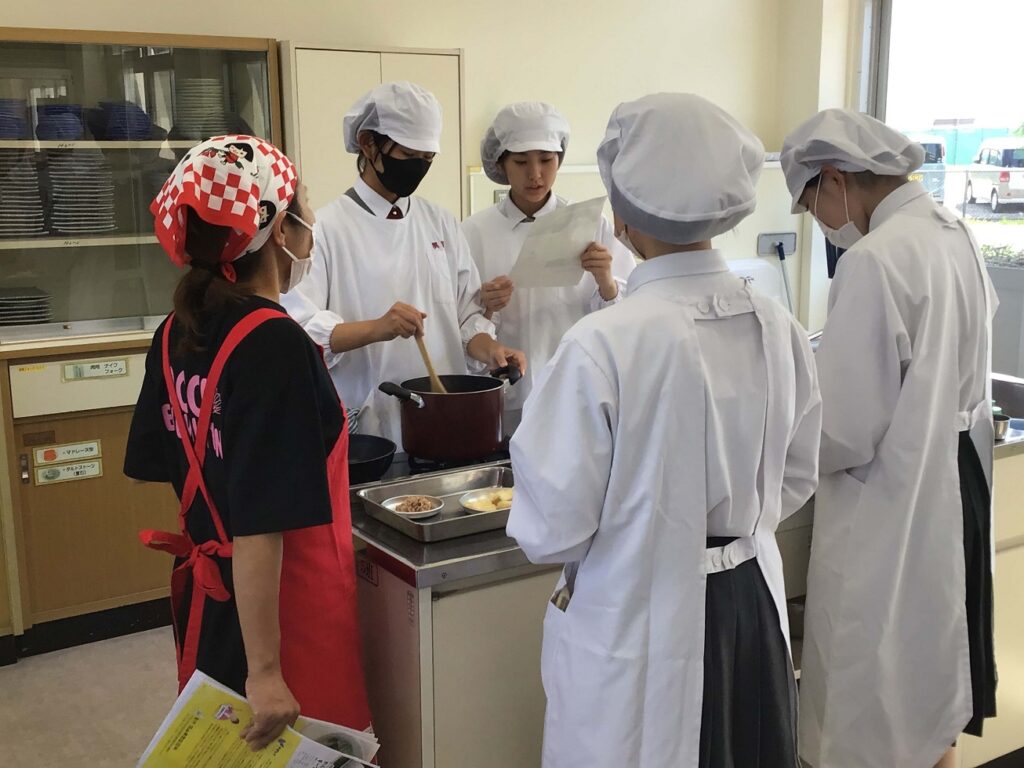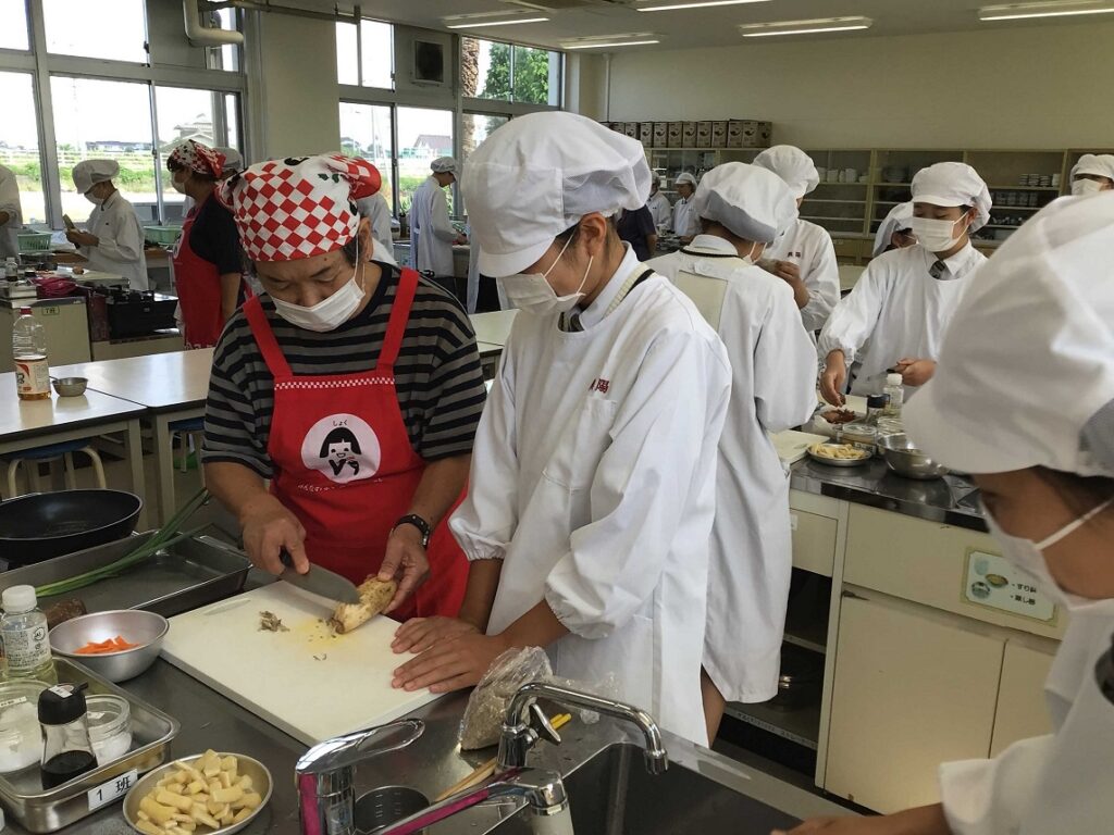 家政科2年生「郷土料理」を学ぶ! 投稿公開日:2025 年 10 月 27 日 投稿カテゴリー:トピック / 家政科 / 授業・実習風景 フードデザインの授業で、JA岡山 藤田支部から4名の方にお越しいただき、郷土料理について出前授業をしていただきました。今回作ったものは、ふなミンチと地元の野菜を使った「ふなめし」と南区特産品アイデアレシピ集で興陽高校の先輩が考案した「春巻き」です。岡山県南部に伝わるふなめしの歴史や根菜の切り方などを丁寧に教えていただき、勉強になりました。これからの実習に活かしていきたいです。