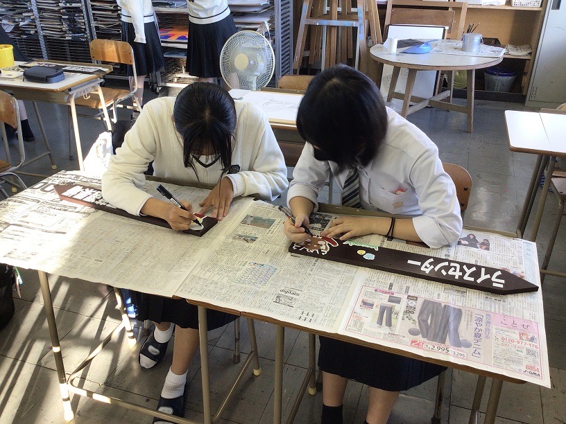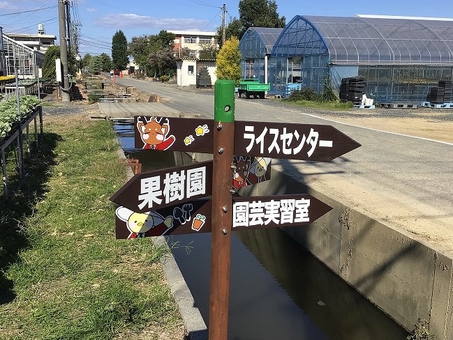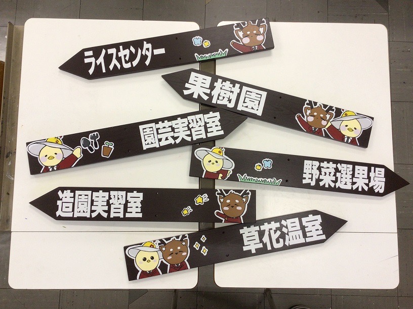 学校のメインストリートに美術部制作の案内看板が立ちました! 投稿公開日:2025 年 10 月 30 日 投稿カテゴリー:トピック / 美術部 / 部活動 興陽高校の校門から続くメインストリートに、美術部1年生が制作した案内看板が設置されました。今回はメインストリートの奥にある、農業学科関係の施設を案内する看板です。昨年度に続き、今年で2回目の制作となります。デザインから色づけまで、部員たちが協力して仕上げました。本校のマスコットキャラクター「ならしかくん」「たまこちゃん」をモチーフに、今年も明るく可愛らしい雰囲気の作品となっています。訪れてくださった方々や生徒たちに、看板を見て楽しんでもらえたら嬉しいです。