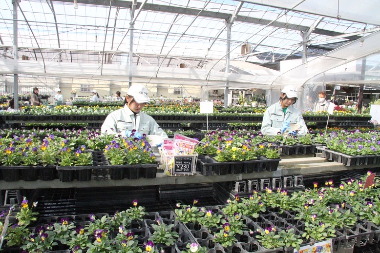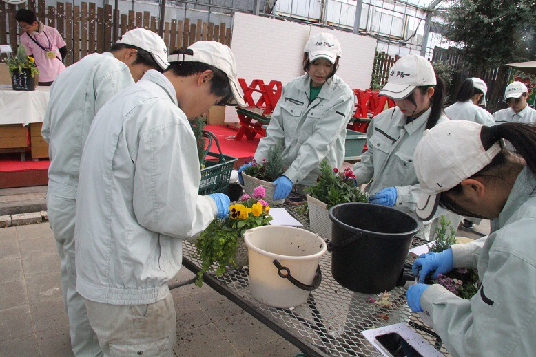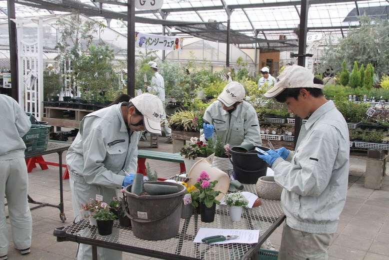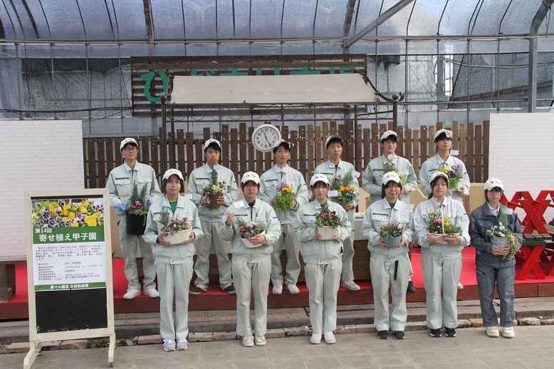 【第14回寄せ植え甲子園に出場しました】 投稿公開日:2025 年 11 月 9 日 投稿カテゴリー:トピック / 造園デザイン科 令和7年11月3日(月)農マル園芸吉備路農園で行われた「第14回寄せ植え甲子園」に、本校造園デザイン科生活環境類型3年11名と2年生有志1名が参加しました。このコンテストは制限時間1時間以内で、農マル園芸内の商品を自由に用いて、材料費2,500円(税抜き・農マル園芸提供)以内になるように計算しながら寄せ植えを制作するものです。今回のテーマは『パンジー・ビオラで秋冬の玄関を華やかに』です。制作した寄せ植えは、一般の方に審査していただき、上位者は表彰されます。本年度も県下の農業高校6校が参加予定です。学校と異なり草花・鉢・小物の種類が多く、また材料費計算の必要もあるため、品定めに奔走していました。しかし、寄せ植えの講習や実践練習に取り組んでいたため、手際の良さが見受けられました。終了後は作品タイトルを書いて出品登録しました。それぞれ練習の成果が出せたのか、終了後はみんな笑顔がこぼれていました。11/8からの投票、11/29の結果発表が楽しみです。