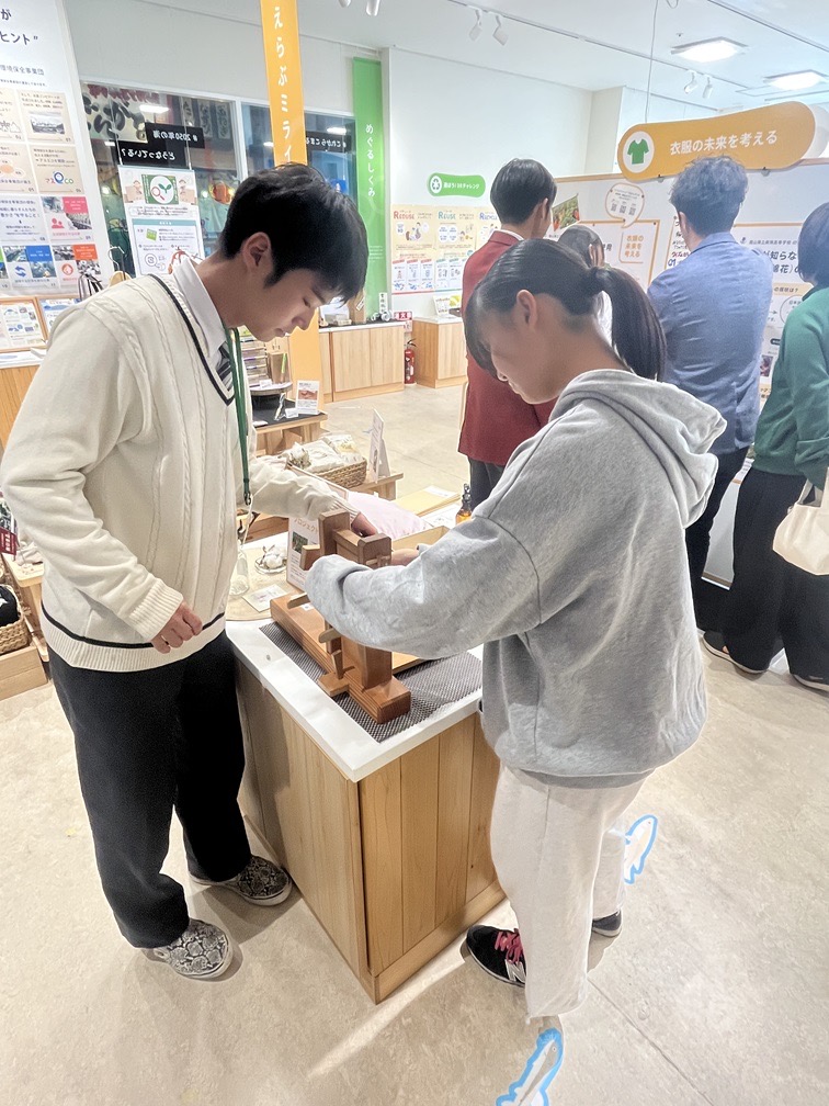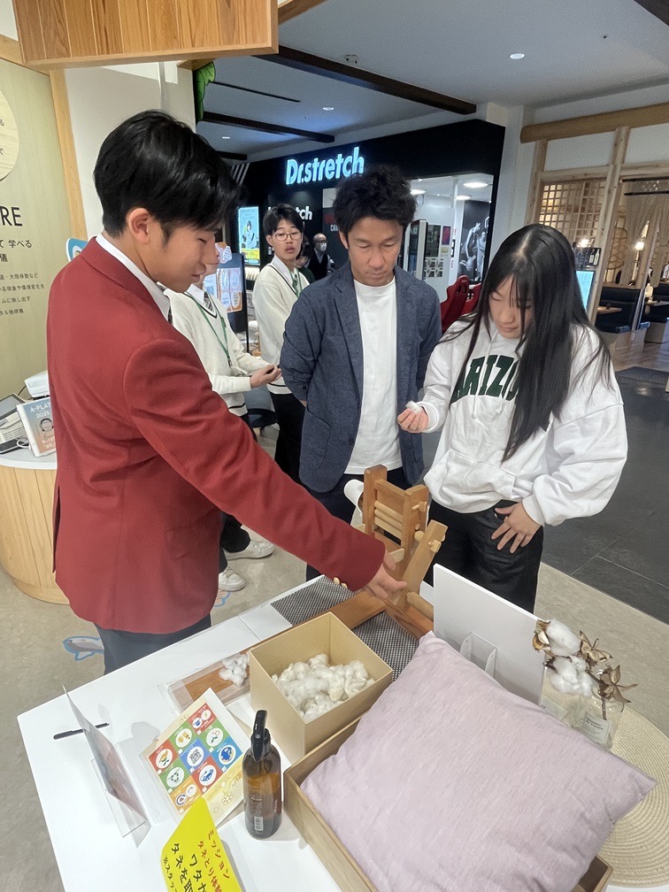 農業クラブ×被服デザイン科×環境学習プラザアスエコ ~綿花プロジェクト発表・体験~ 投稿公開日:2025 年 12 月 1 日 投稿カテゴリー:トピック / 農業科 / 被服デザイン科 / 農業クラブ 令和7年11月23日(日)、イオン岡山6階の「環境学習プラザアスエコ」で、農業学科の生徒が栽培・収穫したワタを、被服デザイン科の生徒が「綿雲クッション(オーガニックコットンクッション)」にして対面販売した取り組みの発表や、綿繰り(綿花の種取り)体験を行いました。衣類の未来についてみんなで考えてみませんか。次回発表・体験は12月13日(土)です。来場お待ちしております。