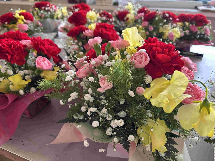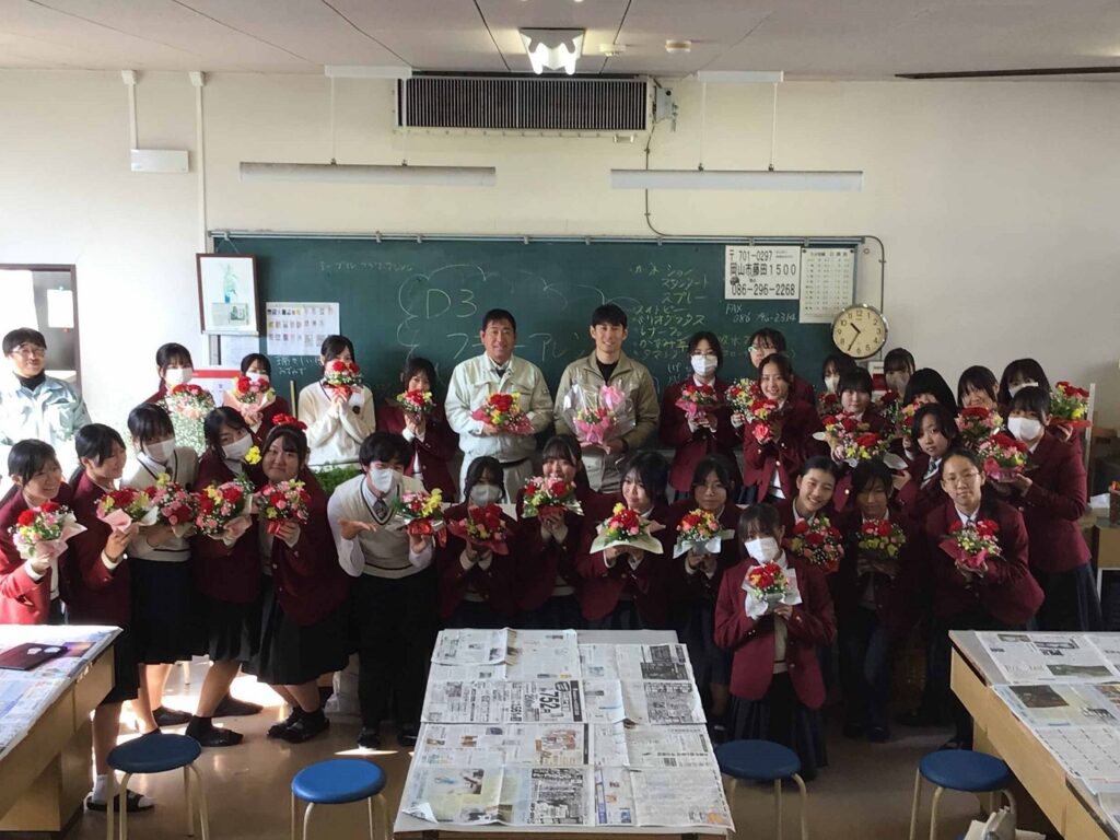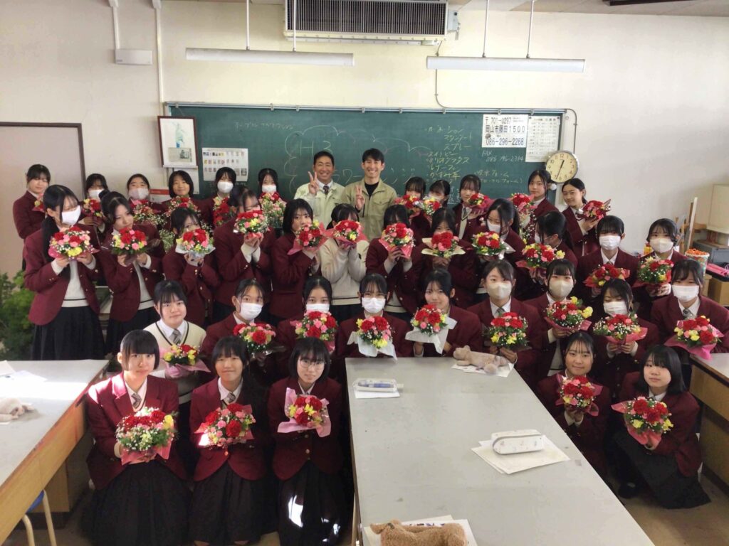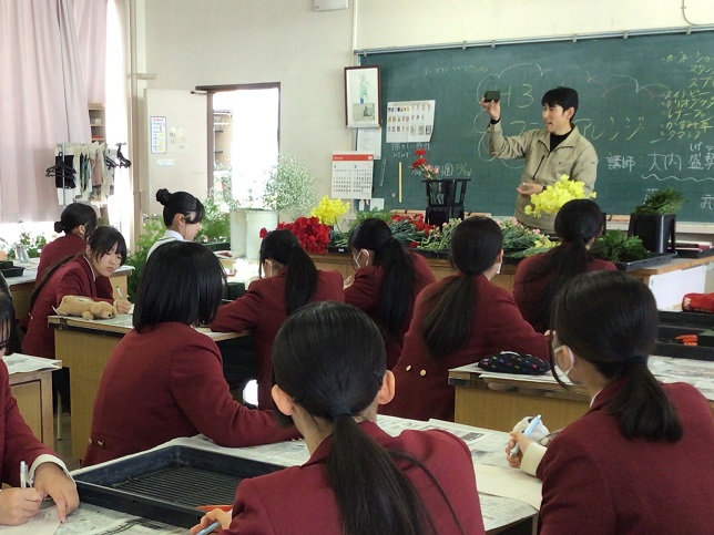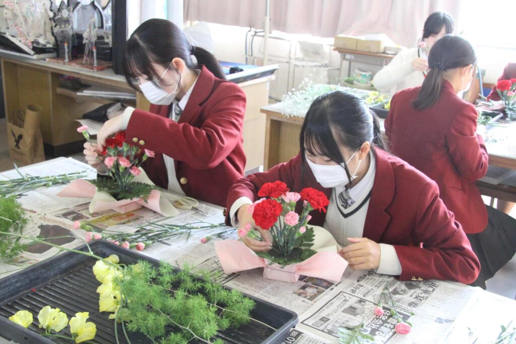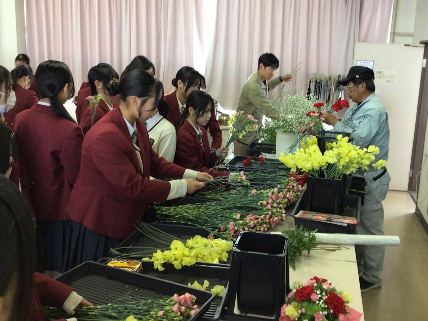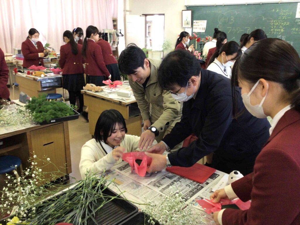 学科を越えて広がる学び!家政科・被服デザイン科がフラワーアレンジメントに挑戦! 投稿公開日:2025 年 12 月 10 日 投稿カテゴリー:造園デザイン科 / 家政科 / 被服デザイン科 / 授業・実習風景 / 校内風景 家庭学科3年生が「生活教養」の授業で、造園デザイン科の先生を講師にお迎えし、フラワーアレンジメントを学びました。農業学科のある興陽高校でしかできない、農業と家庭が連携した授業です。校長先生も授業の様子を見学に来てくださり、そのまま参加?!教室には色とりどりのお花が並び、学校で育てているグリーンも材料として使わせていただきました。専門の先生のご指導のもと、花の色合わせや配置の工夫を学びながら、アレンジメント作品を楽しく制作しました。これからも日々の暮らしに花のある生活を取り入れながら、学びを広げていきたいと思います。
