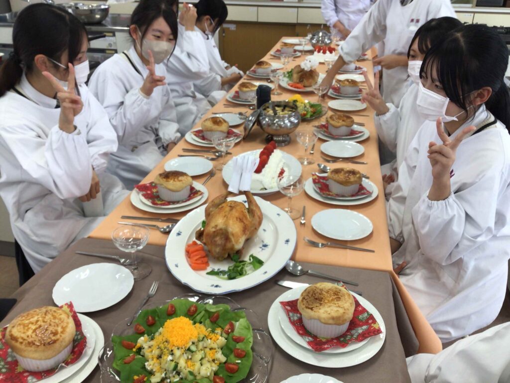 家政科3年 調理実習でクリスマスパーティー! 投稿公開日:2025 年 12 月 11 日 投稿カテゴリー:トピック / 家政科 / 授業・実習風景 / 校内風景 家政科3年生の食物科学類型がクリスマス献立の調理実習を行いました。前日からチキンやパイ生地を仕込み、当日はクリスマスケーキのデコレーションまで、手際よく実習できました。さすが3年生ですね。卒業まであと何回調理実習ができるかな。楽しく最後まで一緒に学びましょう!