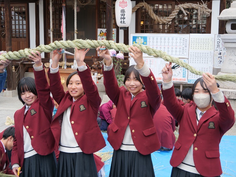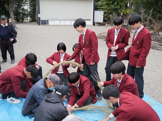 農業科×藤田神社 ~しめ縄づくり~ 投稿公開日:2025 年 12 月 15 日 投稿カテゴリー:トピック / 農業科 農業科2年生が藤田神社のしめ縄づくりに参加しました。本校で栽培した青刈りの稲わらを使用して、宮司さんや地元の地区役員の皆さんと制作しました。高校生も楽しみながら伝統文化を体験させていただきました。