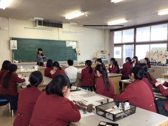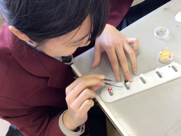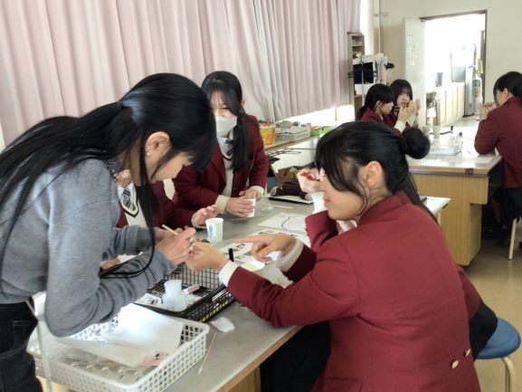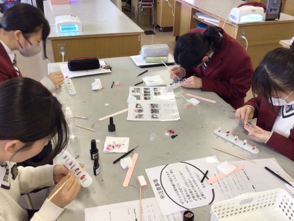 被服デザイン科3年生「ネイルアート講習会」を受けました。 投稿公開日:2026 年 1 月 22 日 投稿カテゴリー:トピック / 被服デザイン科 / 授業・実習風景 入学当時から楽しみにしていた、ジェルネイルの講習を受けました!NAIL gallery GODAI のネイリスト 五代 真美 先生にお越しいただき、ファッショントータルコーディネイトとしてのネイルアートに関する講義と実技講習をしていただきました。まず、ネイルケアの基礎(ファイリング、キューティクルケア、バッフィング)で、自分の爪を綺麗に整え、次に、チップにジェルを塗り、硬化させ、ドットの技法を教えていただきました。そして、ホログラムをのせて可愛いネイルにしたり、マグネットネイルでかっこいいネイルにしたりと、自分のやってみたいネイルアートに挑戦することができました。楽しくて!楽しくて!時間を忘れて取り組みました。また是非やってみたいです!!
