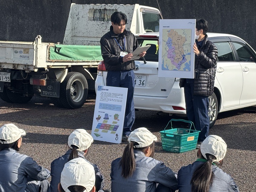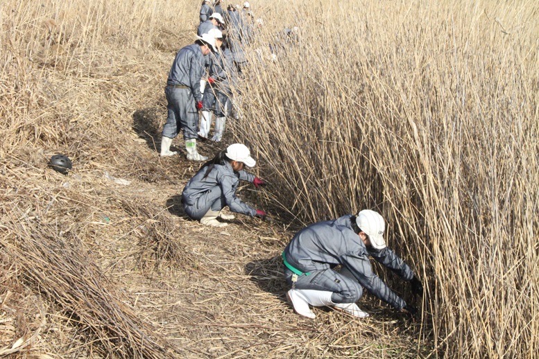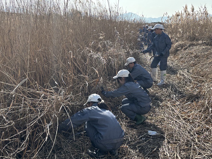 造園デザイン科1年生 ~葦刈り実習~ 投稿公開日:2026 年 1 月 25 日 投稿カテゴリー:トピック / 造園デザイン科 / 授業・実習風景 児島湖の環境保全活動として、なださきレークサイドパークで葦刈り作業を行いました。実習では岡山県環境文化部環境管理課の方から児島湖の環境についてお話をいただき、下電造園土木株式会社の方から刈り方の指導を受けました。安全に気をつけ作業を行い、時間内に目標範囲を刈ることができました。