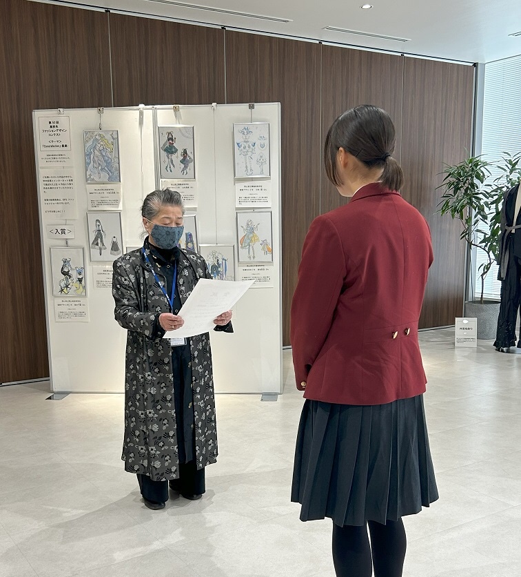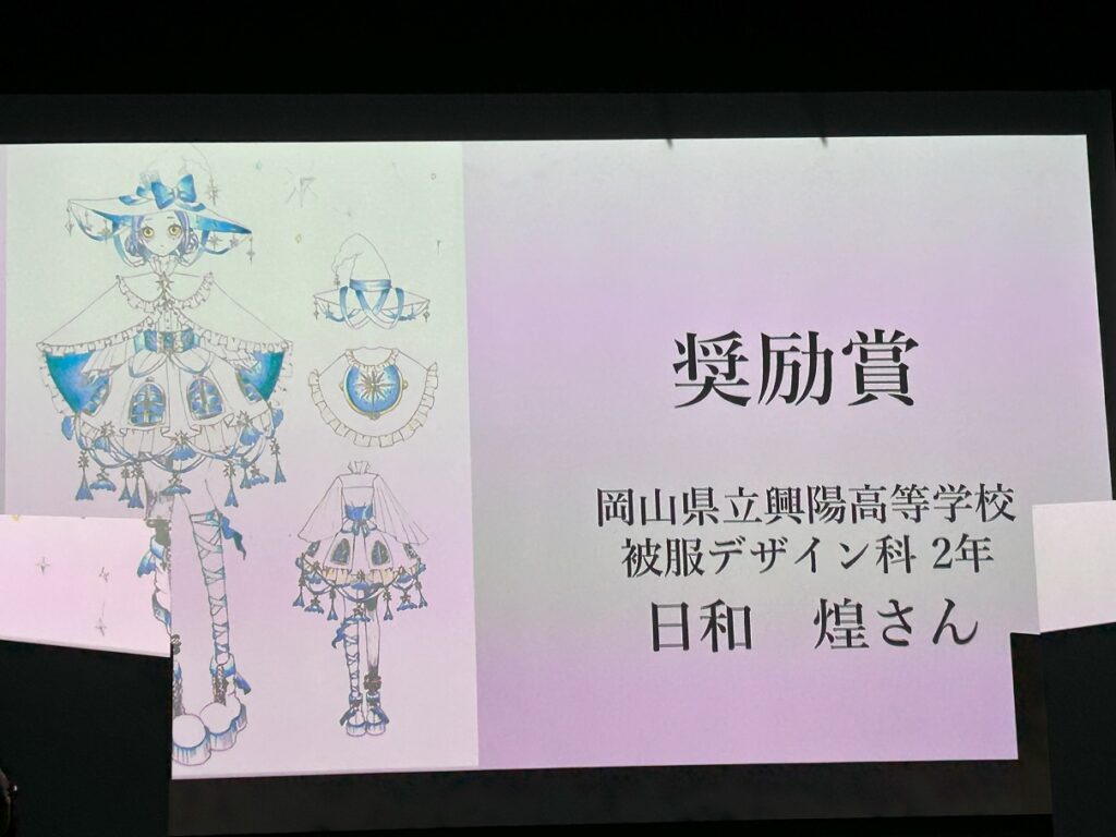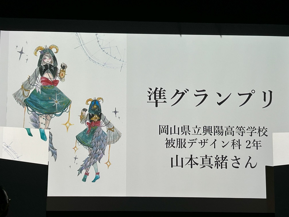 被服デザイン科 第50回 高校生ファッションデザインコンテスト出場!「Constellation~星座~」(岡山ファッションスクール主催) 投稿公開日:2026 年 2 月 10 日 投稿カテゴリー:トピック / 被服デザイン科 2月9日(日)、杜の街グレースで開催された高校生ファッションデザインコンテストの最終選考に被服デザイン科2年山本真緒さんと、同科2年日和煌さんが選ばれました。デザイン画による一次選考があり、3点に絞られ、その後Web投票などにより、1位が決定します。その結果、山本さんは「準グランプリ」、日和さんは「奨励賞」を受賞し、岡山ファッションの校長先生に表彰していただきました。この受賞の喜びを糧に、今後も頑張っていきます!