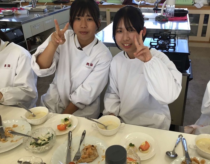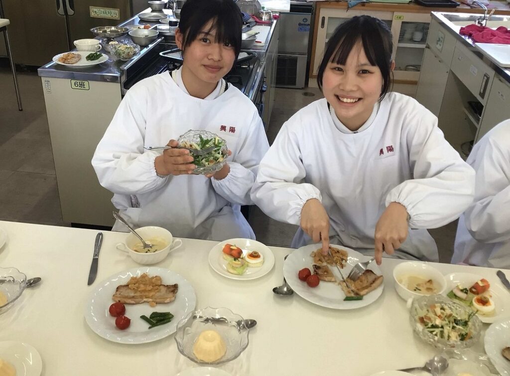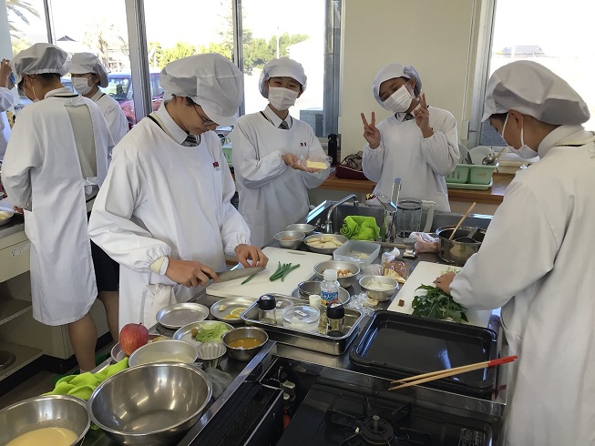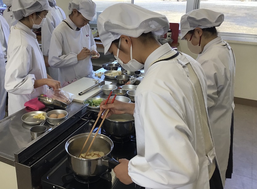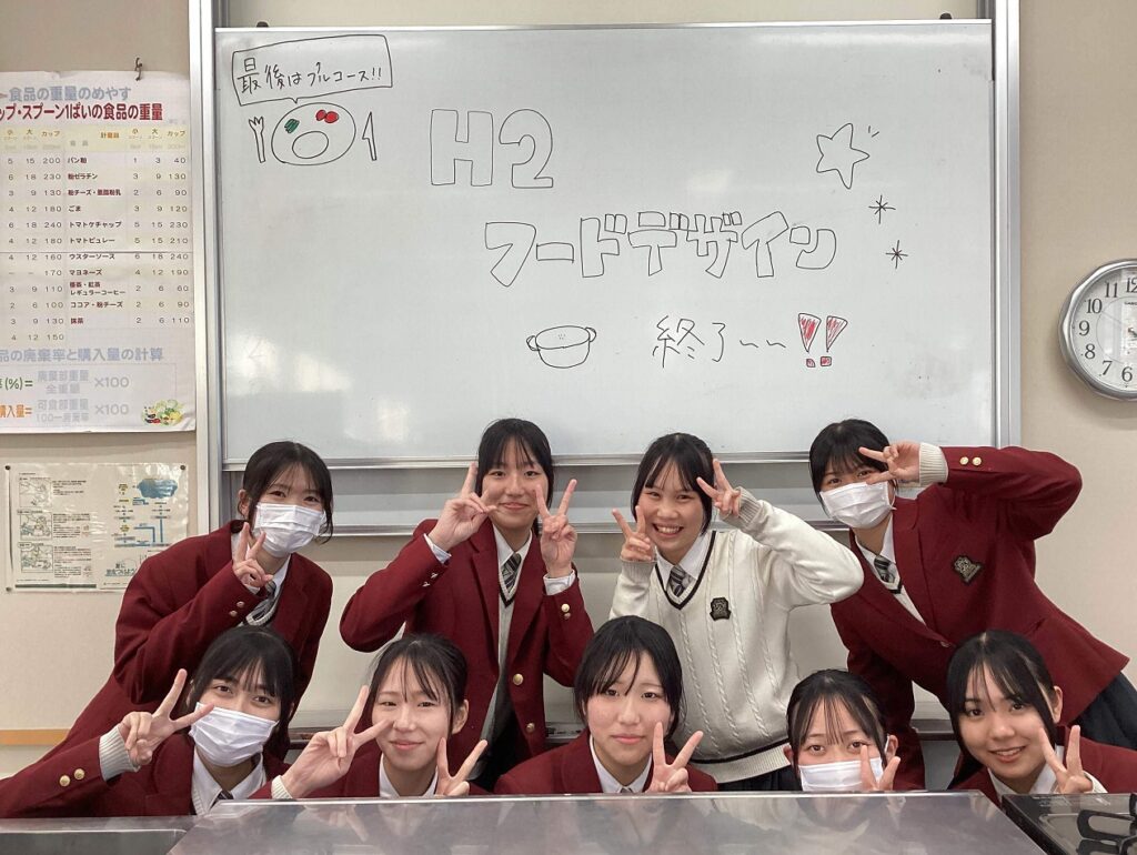 家政科2年生 笑顔あふれる最後の調理実習! 投稿公開日:2026 年 2 月 19 日 投稿カテゴリー:トピック / 家政科 / 授業・実習風景 / 校内風景 家政科は3年生になると類型に分かれてそれぞれの学びを深めていくため、クラス全員で行う「フードデザイン」の調理実習は今回が最後でした。1年生の頃から2年間続けてきた調理実習もいよいよ締めくくりの時期となりました。調理の技術を身につけるだけではなく、協力することの大切さや作る楽しさを実感できた授業でした。食は元気の源です。生活の中でこれからも丁寧に食と向き合っていきましょう!