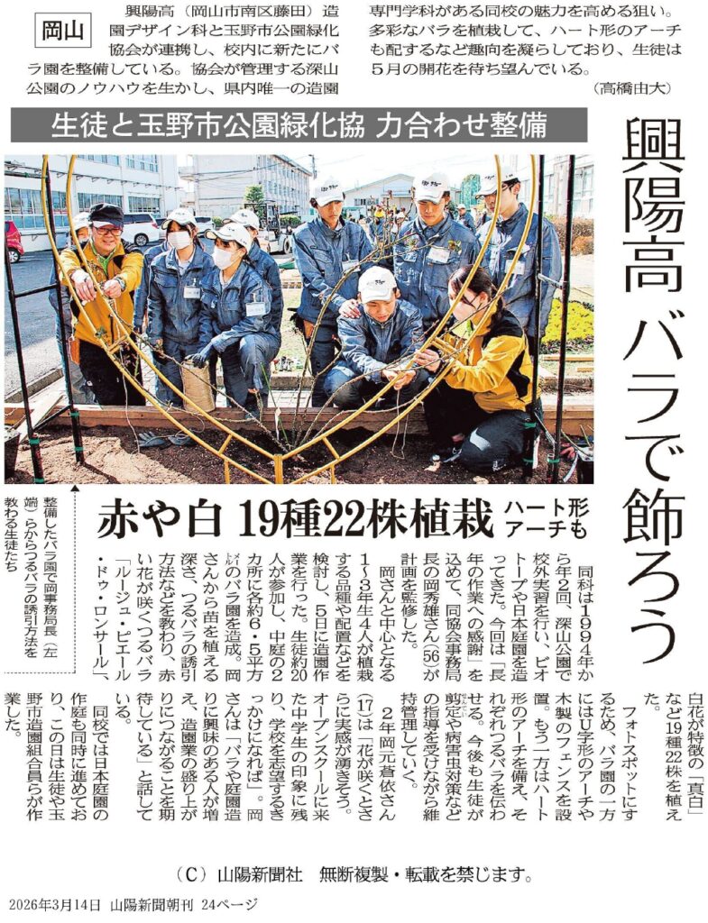山陽新聞に生徒と玉野市公園緑化協会が校内にバラ園を整備している記事が掲載されました。 投稿公開日:2026 年 3 月 19 日 投稿カテゴリー:お知らせ / トピック / 農業機械科 / 造園デザイン科