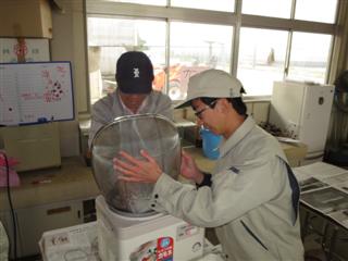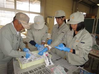 農業科3年作物類型生が餅作りに挑戦 投稿公開日:2015 年 12 月 28 日 投稿カテゴリー:トピック / 農業科 前日から水に浸漬したもち米を餅つき器に入れます 豆餅用に黒大豆を選別し、水洗いしてから入れます。 豆餅から開始です。初めての杵(きね)と臼(うす)です。 豆餅らしくなってきました。少ししんどいけれど、楽しい。 丸餅に仕上げます。これもなかなか難しいですが、日下先生からコツを学びました。 赤米100%の餅も作りました。独特のいい香りがしました。 出来たての「きなこ餅」がやらかくてのびもあってとても美味しかった。1年間がんばって良かった。 あん餅、きなこ餅、玄米餅、赤米餅、黒豆餅、白餅ができました。材料の餅米、赤米、黒大豆、小豆、すべて学校で栽培したものです。12月25日クリスマスの日の実習でした。