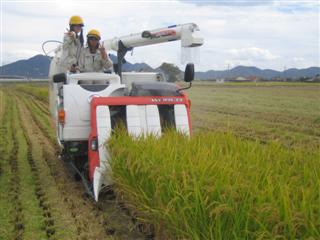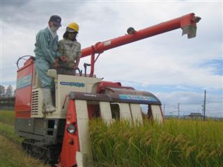 | 収穫後はコンバインの掃除と点検を能率良く行いました。 |