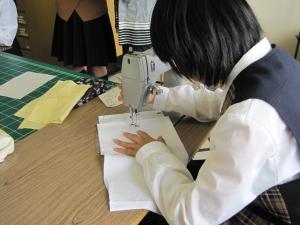 実技の内容は、なみ縫い・まつり縫い・半返し縫い・ボタンつけとミシンを使っての図案縫い・三つ折りミシンです。今の段階は時間を計測していませんが、本番に向けて制限時間内に、手際よくきれいに仕上げることが目標です。