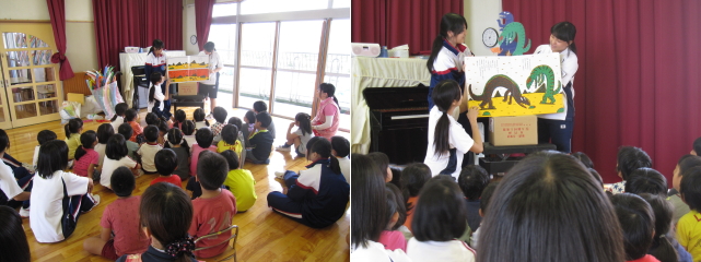 バルーンアートや絵本の読みきかせ、ハンカチ落としやじゃんけん列車などこちらが準備した保育活動を行いました。