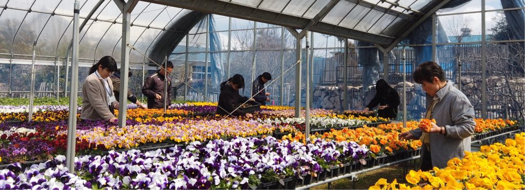 3月5日(木)午前10時から約2時間、約5000鉢のパンジー・ビオラで一杯の草花ハウスに農業以外の先生方が集い、花殻摘みと寄せ植え作りを手伝ってくれました。新型コロナウィルスへの対応のため生徒実習が実施できないので手伝って欲しいと先生方に呼びかけたところ、多くの先生が力を貸してくれました。先生方ありがとうございました。美しい花に囲まれて、造園デザイン科の生徒の学びを体験するよい機会となりました。先生方との良いコミュニケーションも取れ、元気を沢山いただきました。なお、完成した寄せ植えは、全て販売スポット「たまこ」で明日販売します。