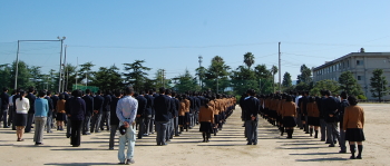 非常ベルが鳴り、誘導の校内放送にしたがって速やかに避難していきます。