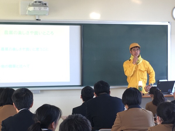 黄ニラ大使から講義いただきました。 Posted on 2017 年 12 月 13 日 by koyohigh100 12月13日(水) 中四国農政局の出前講座として「職業としての農業」という講義を黄ニラ大使をされている著名な黄ニラ・パクチー農家の植田輝義さんに講義していただきました。 農業を学び始めたばかりの農業科1年生が対象でしたが、とても興味深い話に聴き入ってしまい、あっという間に時が流れました。 休憩時間には生徒たちが植田さんから離れません。 NHKにも取材していただきました。