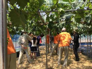 6月16日(土)、農業科の果樹類型の生徒が主催の「親子deブドウ栽培」本年度版は、今日で3日目となりました。本校果樹園に小学生6名とその保護者(5家族) を迎え、今回はジベレリン処理2回目の作業を体験していただきました。品種は収穫時期が11月のため冬ブドウといわれる「紫苑(しえん)」です。6月2日の枝管理からスタートしたこの企画は、2、3年の果樹専攻生の指導のもと、収穫予定の11月まで続きます。ブドウが甘さを一杯ため込んで美味しくなってくれるのが楽しみです。(o.y)