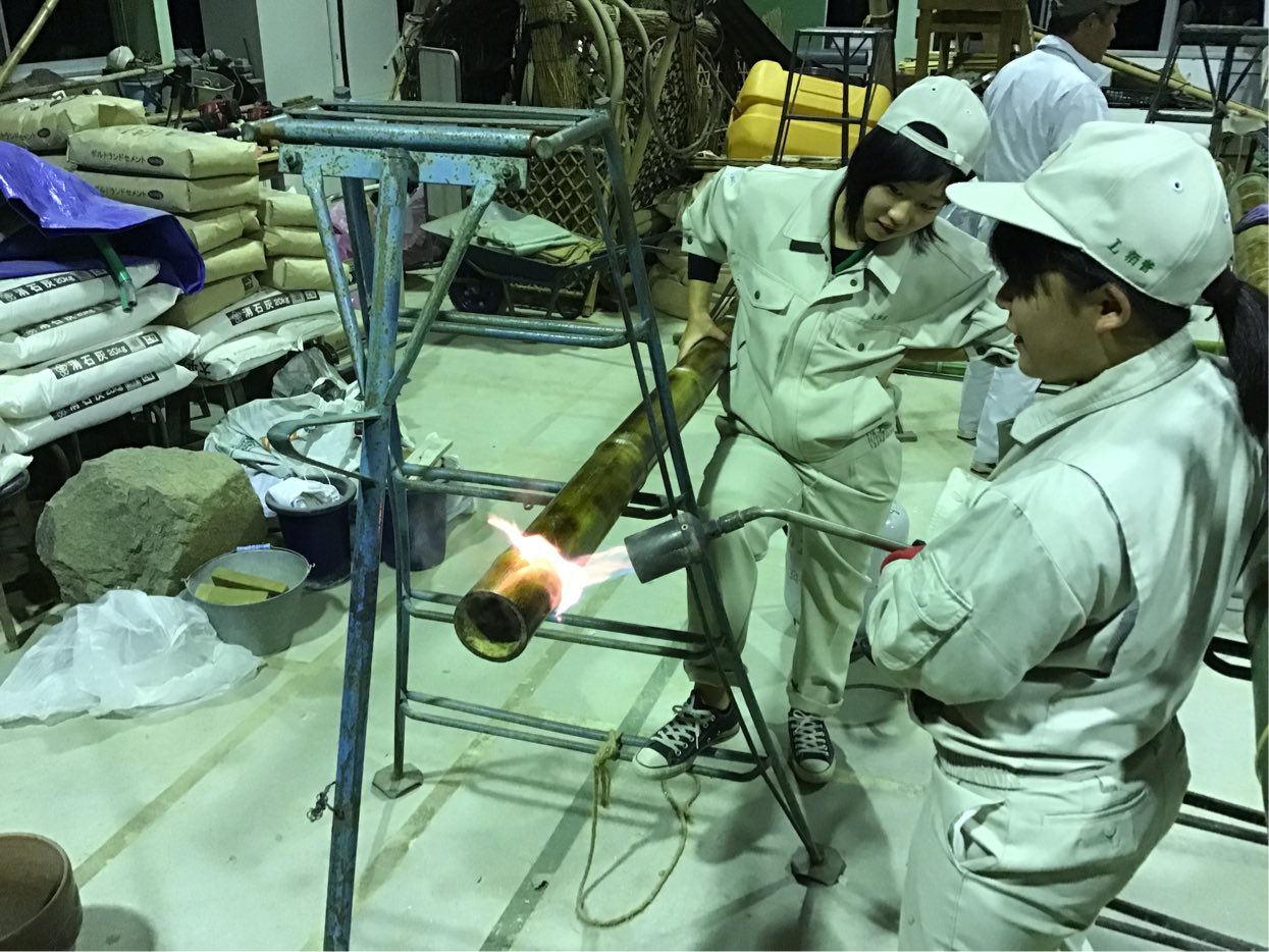 また、造園デザイン科の実習室ではラン展に向けての準備も始まりました。写真は青竹をバーナーで焼いて光沢を出している様子です。